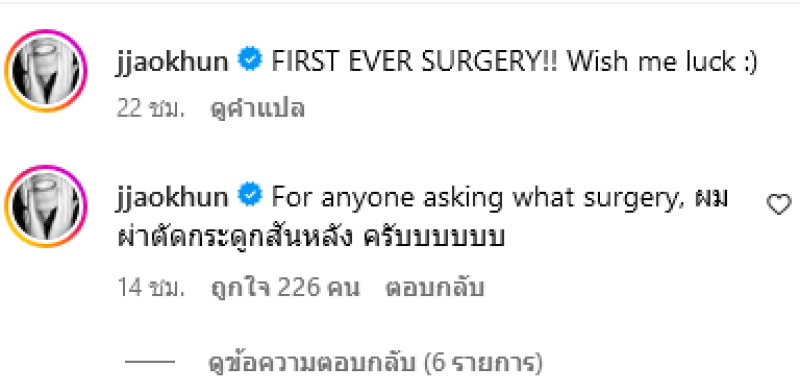 พร้อมทั้งเขียนแคปชั่นว่า FIRST EVER SURGERY!! Wish me luck :) และบอกเพิ่มเติมว่า "For anyone asking what surgery, ผมผ่าตัดกระดูกสันหลัง ครับบบบบบ" ท่ามกลางคนในวงการและแฟนๆต่างส่งกำลังใจเป็นจำนวนมาก