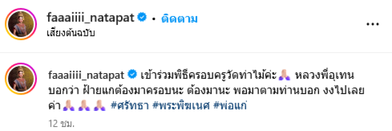 โดย ฝ้าย ได้โพสต์คลิปในอินสตาแกรมส่วนตัวขณะที่ครอบครูพร้อมแคปชั่นว่า เข้าร่วมพิธีครอบครูวัดท่าไม้ค่ะ หลวงพี่อุเทนบอกว่า ฝ้ายแกต้องมาครอบนะ ต้องมานะ พอมาตามท่านบอก งงไปเลยค่า ศรัทธา พระพิฆเนศ พ่อแก่