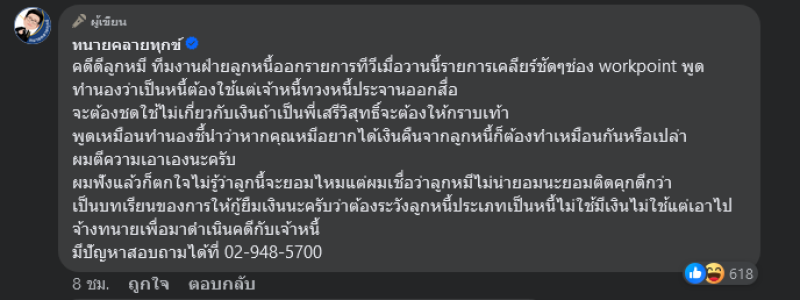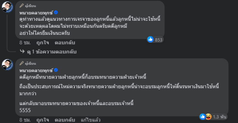 ซึ่ง ลูกหมี ก็ไม่ลีรอที่จะเข้ามาคอมเมนต์ว่า คุณพระ! ด้าน ทนายเดชา ก็ได้ถามกลับไป พร้อมกราบเท้าลูกหนี้หรือยังครับ ซึ่งเจ้าตัวไม่รอช้าโตกลับเนียนๆ ด้วยข้อความ่า 'เดี๋ยวไปทำความดีสอนบุคลิกภาพในเรือนจำ'