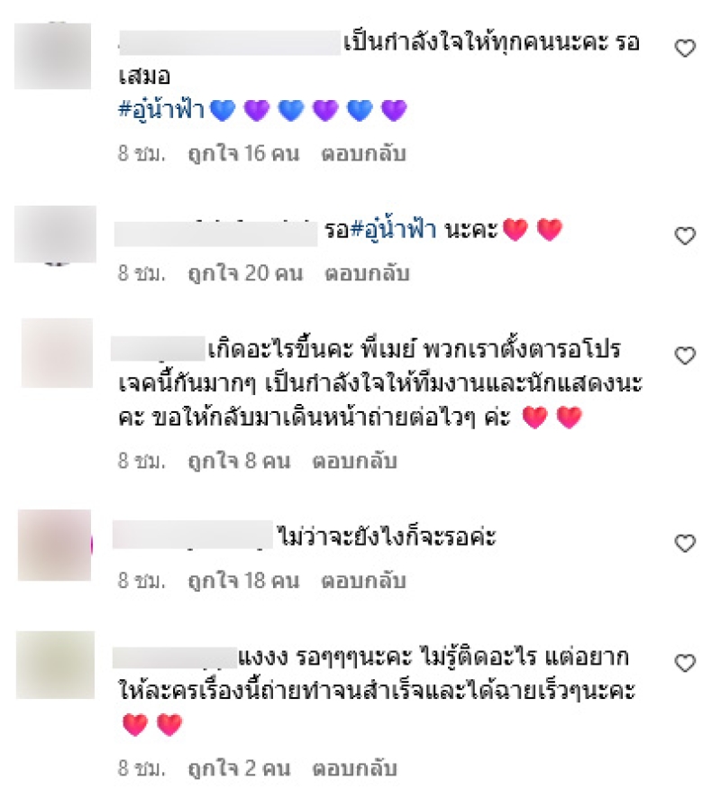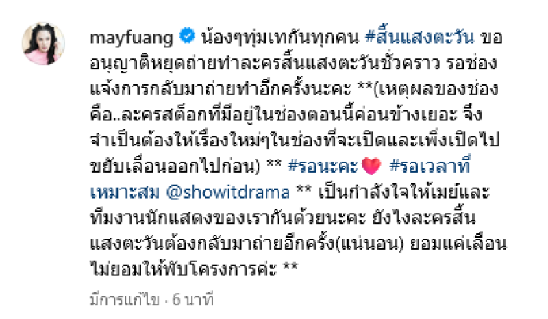 ทางด้านผู้จัดอย่าง เมย์ ได้โพสต์ในอินสตาแกรมส่วนตัวว่า น้องๆทุ่มเทกันทุกคน สิ้นแสงตะวัน ขออนุญาติหยุดถ่ายทำละครสิ้นแสงตะวันชั่วคราว รอช่องแจ้งการกลับมาถ่ายทำอีกครั้งนะคะ รอนะคะ รอเวลาที่เหมาะสม showitdrama (เหตุผลของช่องคือ..ละครสต็อกที่มีอยู่ในช่องตอนนี้ค่อนข้างเยอะ จึงจำเป็นต้องให้เรื่องใหม่ๆในช่องที่จะเปิดและเพิ่งเปิดไปขยับเลื่อนออกไปก่อน) เป็นกำลังใจให้เมย์และทีมงานนักแสดงของเรากันด้วยนะคะ ยังไงละครสิ้นแสงตะวันต้องกลับมาถ่ายอีกครั้ง(แน่นอน) ยอมแค่เลื่อน ไม่ยอมให้พับโครงการค่ะ