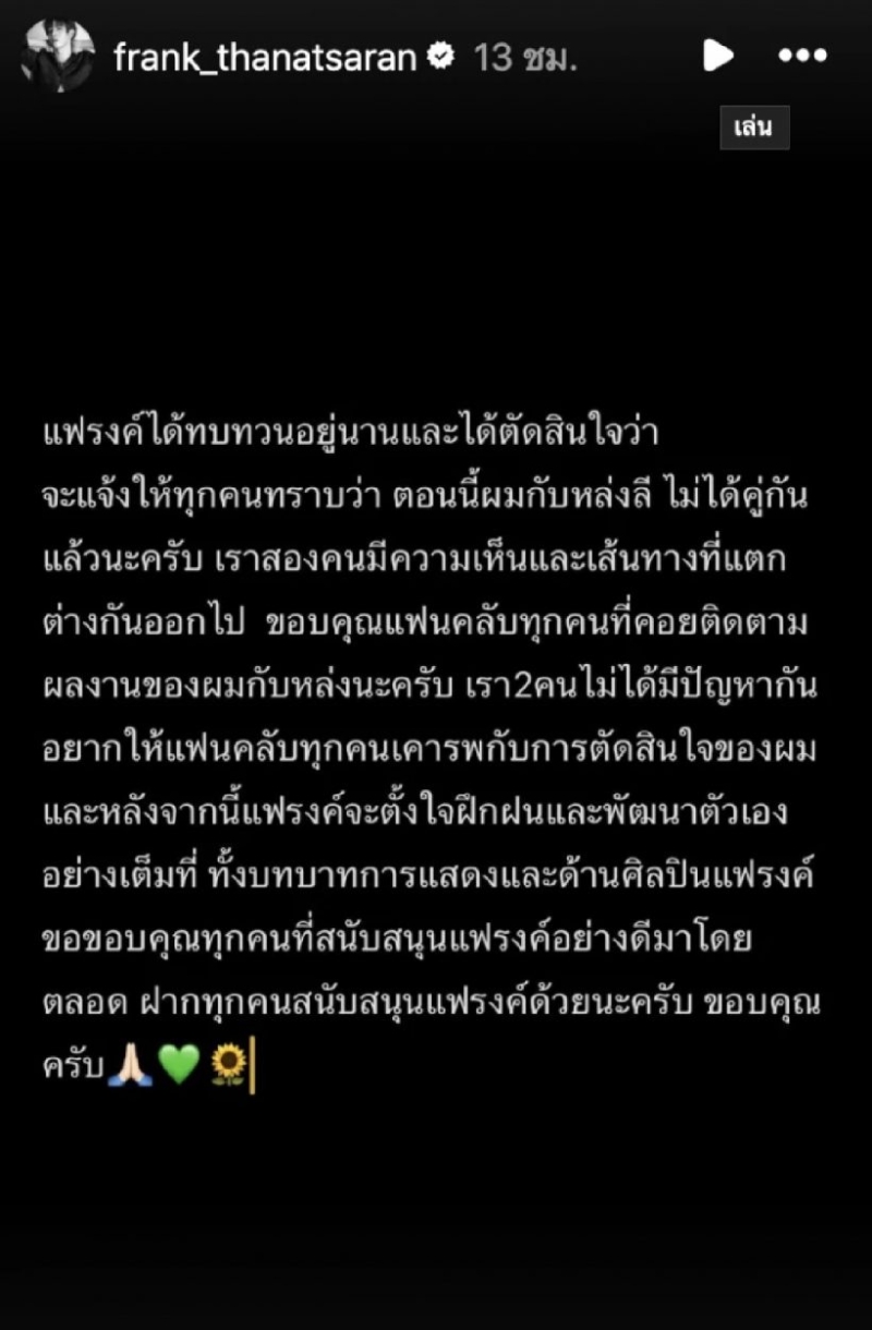จากกรณี แฟรงค์-ธนัตถ์ศรันย์ ซำทองไหล ออกมาประกาศไม่ได้ร่วมงานคู่กับคู่จิ้น หล่งซื่อ ลีแล้ว โดยได้ระบุว่า แฟรงค์ได้ทบทวนอยู่นานและได้ตัดสินใจว่าจะแจ้งให้ทุกคนทราบว่า ตอนนี้ผมกับหล่งลี ไม่ได้คู่กันแล้วนะครับ เราสองคนมีความเห็นและเส้นทางที่แตกต่างกันออกไป ขอบคุณแฟนคลับทุกคนที่คอยติดตามผลงานของผมกับหล่งนะครับ เรา 2 คน ไม่ได้มีปัญหากันอยากให้แฟนคลับทุกคนเคารพกับการตัดสินใจของผม