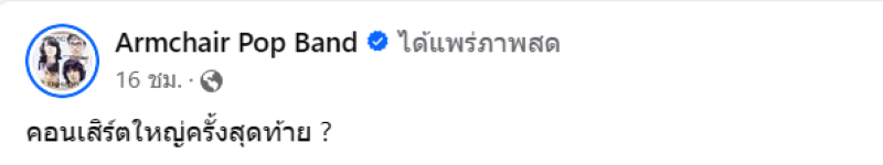 โดยมี โย่ง อาร์มแชร์ (ร้องนํา / กีต้าร์), จ้อ-พีระพล ลีละเศรษฐกุล (เบส / แซ็คโซโฟน)และพี่ใหญ่ อย่าง ผึ้ง-จตุตถพงศ์ รฺมาคม (กีต้าร์) และ อ้วน-อธิษว์ ศรสงคราม เจ้าของเสียงฟลุ๊ตสุดหวานที่มา พร้อมมาดเท่ๆ สําหรับในคอนเสิร์ตใหญ่เต็มรูปแบบที่มี Line Up พวกเราทั้ง 4 คน จะได้ร่วมเล่นด้วย กันครั้งสุดท้าย ในรอบ 10 กว่าปี คอนเสิร์ตนี้ตั้งใจจัดขึ้นตั้งนานแล้ว แต่ด้วยเหตุผลหลายประการเลยต้องเปลี่ยนวัน มาก่อน ก่อนที่จะตัดสินใจประกาศเมื่อสักประมาณต้นเดือนที่แล้ว ว่าจะจัดขึ้นเป็นวันที่ 9 พฤศจิกายน นี้ นะครับ จริง ๆ วง ARMCHAIR อายุครบ 23 ปี พอดี ในปี 2024 นี้ ตั้งแต่เราวางแผง เทปปี 2001 ที่วันนี้ต้องไลฟ์กันเพราะว่ามีคําถามเข้ามาในข้อความเยอะมาก