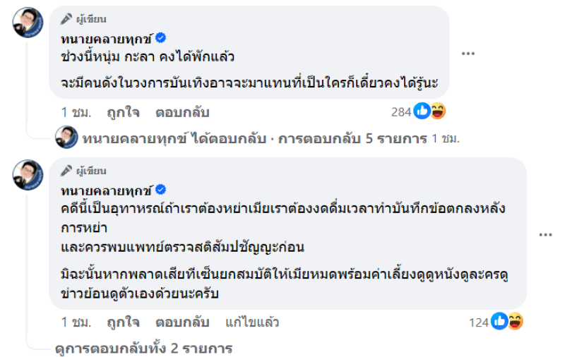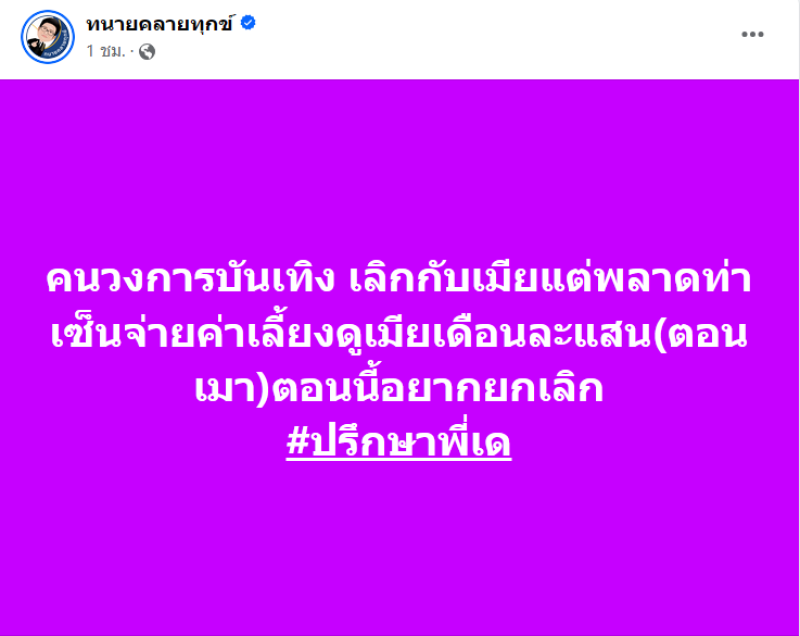 เรียกได้ว่า เป็นประเด็นร้อนอีกครั้ง เมื่อทาง ทนายเดชา กิตติวิทยานันท์ เจ้าของเพจ ทนายคลายทุกข์ ที่ได้โพสต์ถึงเรื่องราวของคนวงการบันเทิง โดยระบุว่า คนวงการบันเทิง เลิกกับเมียแต่พลาดท่าเซ็นจ่ายค่าเลี้ยงดูเมียเดือนละแสน(ตอนเมา)ตอนนี้อยากยกเลิก #ปรึกษาพี่เด