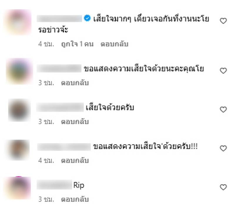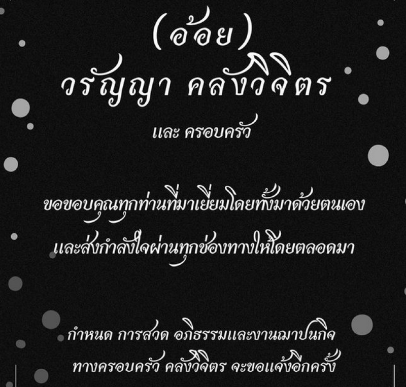ถึงเวลาพักให้สบายค่ะพี่ หลายวันมานี่พวกเรารอแต่ปาฏิหาริย์ที่ไม่มีจริง ทุกคนจะคิดถึงแต่อ้อยที่ทำให้เรามีแต่รอยยิ้มและความฮา เสียงหัวเราะของอ้อยยังอยู่ตรงนี้เสมอ รักพี่นะ RIP แฟนๆต่างคอมเมนต์แสดงความเสียใจกันอย่างมาก