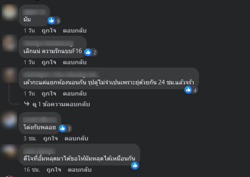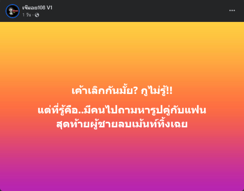 ซึ่งทางเพจเจ๊มอย108 ได้โพสต์ว่า เค้าเลิกกันมั้ย? xูไม่รู้!! แต่ที่รู้คือ..มีคนไปถามหารูปคู่กับแฟนสุดท้ายผู้ชายลบเม้นท์ทิ้งเฉย งานนี้ทำเอาแฟนๆคอมเมนต์กันสนั่น อาทิ มาเร็วไปหน่อย เดี๋ยวกลับมาใหม่,แต่ละมื่อแต่ละเดย์,เลิกแน่ ความรักแบบF16 เป็นต้น
