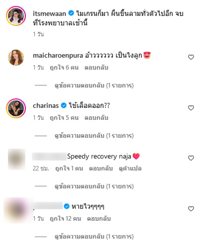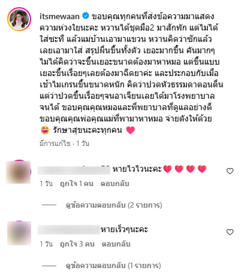 พร้อมเขียนข้อความว่า ไมเกรนก็มา ผื่นขึ้นลามทั่วตัวไปอีก จบที่โรงพยาบาลเช้านี้ ทั้งยังโพสต์เพิ่มเติมอีกว่า ขอบคุณทุกคนที่ส่งข้อความมาแสดงความห่วงใยนะคะ หวานได้ชุดมือ2 มาสักพัก แต่ไม่ได้ใส่ซะที แล้วแม่บ้านเอามาแขวน หวานคิดว่าซักแล้วเลยเอามาใส่ สรุปผื่นขึ้นทั้งตัว เยอะมากขึ้น คันมากๆไม่ได้คิดว่าจะขึ้นเยอะขนาดต้องมาหาหมอ แต่ขึ้นแบบเยอะขึ้นเรื่อยๆเลยต้องมาฉีดยาค่ะ