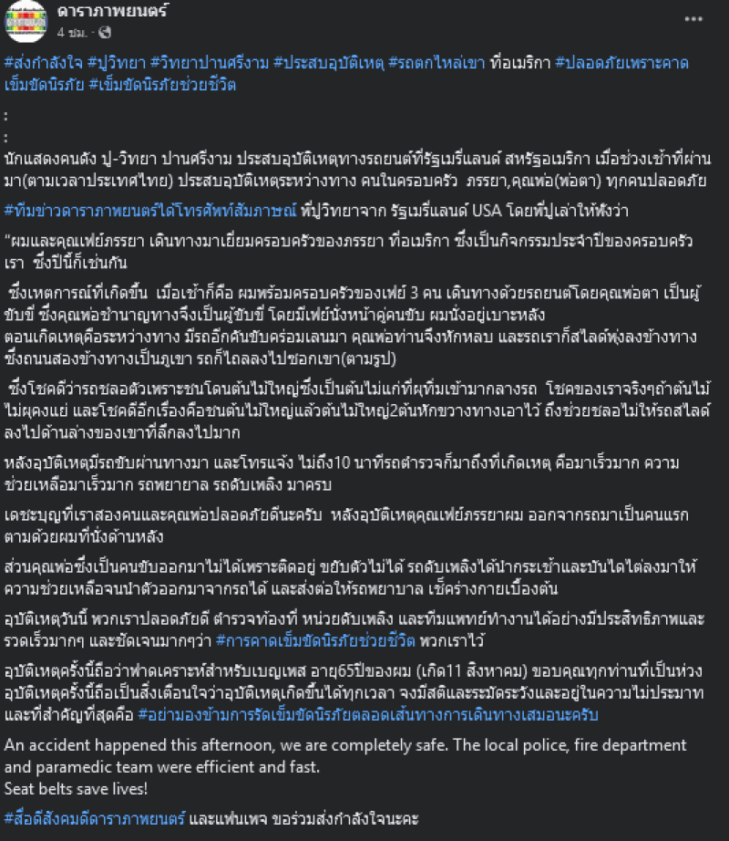 หลังอุบัติเหตุมีรถขับผ่านทางมา และโทรแจ้ง ไม่ถึงนาทีรถตำรวจก็มาถึงที่เกิดเหตุ คือมาเร็วมาก ความช่วยเหลือมาเร็วมาก รถพยายาล รถดับเพลิงมาครบ เดชะบุญที่เราสองคนและคุณพ่อปลอดภัยดีนะครับ หลังอุบัติเหตุคุณเฟย์ภรรยาผม ออกจากรถมาเป็นคนแรก