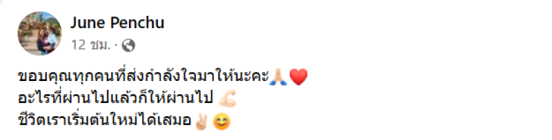 ล่าสุด ทาง จูน เพ็ญชุลี ได้โพสต์ครั้งแรกหลังเรื่องหย่าเสร็จแล้ว พร้อมระบุข้อความว่า ขอบคุณทุกคนที่ส่งกำลังใจมาให้นะคะ อะไรที่ผ่านไปแล้วก็ให้ผ่านไป ชีวิตเราเริ่มต้นใหม่ได้เสมอ