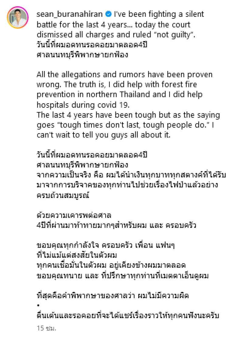 ขอบคุณทุกกำลังใจ ครอบครัว เพื่อน แฟนๆ ที่ไม่แม้แต่สงสัยในตัวผม ทุกคนเชื่อมั่นในตัวผม อยู่เคียงข้างผมมาตลอด ขอบคุณทนาย และที่ปรึกษาทุกท่านที่เมตตาเอ็นดูผม ที่สุดคือคำพิพากษาของศาลว่า ผมไม่มีความผิดตื่นเต้นและรอคอยที่จะได้แชร์เรื่องราวให้ทุกคนฟังนะครับ I've been fighting a silent battle for the last 4 years... today the court dismissed all charges and ruled "not guilty".
