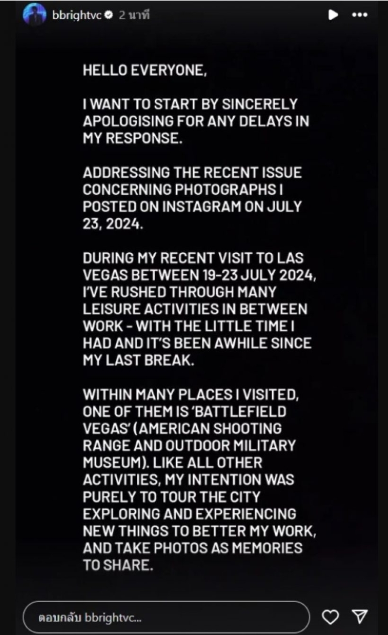 ล่าสุด ไบร์ท วชิรวิชญ์ ได้เคลื่อนไหวโดยการลบโพสต์ดังกล่าวทิ้งแล้ว และโพสต์ข้อความผ่านสตอรี่ไอจีเพื่อแสดงเจตนาในการโพสต์รูปดังกล่าว โดยไบร์ทได้ชี้แจงว่า จริงๆ แล้วต้องการไปเที่ยวชมเมือง สำรวจและสัมผัสประสบการณ์สิ่งใหม่ๆ และถ่ายรูปเป็นความทรงจำ และแบ่งปันให้กับแฟนๆ อยากบอกทุกคนว่าไม่ได้มีวาระซ่อนเร้นใดทั้งสิ้น ทางไบร์ทตระหนักดีกว่าภาพดังกล่าวทำให้เกิดความเข้าใจผิดและการตีความเจตนาที่แท้จริงของเขาไม่ถูกต้อง