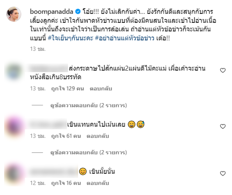 ล่าสุด ทางบุ๋ม ปนัดดา ได้ออกมาโพสต์โต้ข่าว หลังมีเพจเอาข่าวไปตีในทางที่ผิด บอกเลยว่าไม่รอช้า รีบโพสต์ผ่านทางอินสตาแกรม ว่า โอ้ย!!! ยังไม่เลิกกันค่า… ยังรักกันดีและสนุกกับการเลี้ยงลูกค่ะ เข้าใจกันพาดหัวข่าวแบบที่ต้องมีคนสนใจและเข้าไปอ่านเนื้อในเท่านั้นถึงจะเข้าใจว่าเป็นการล้อเล่น ถ้าอ่านแต่หัวข้อข่าวก็จะเม้นกันแบบนี้ #ใจเย็นๆกันนะคะ #อย่าอ่านแต่หัวข้อข่าว เด้อ!!