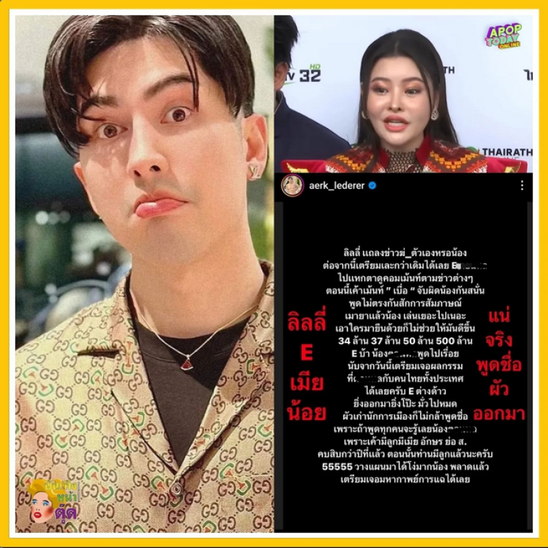 ทั้งยังบอกว่า ที่ตนมาอยู่เมืองนอกไม่ได้หนีหมายจับ ตนมีครอบครัวอยู่ต่างประเทศ แต่ที่ไม่กลับไทยเพราะมีการแกล้งออกหมาย ทุกอย่างมันเวอร์ไปหมด พยายามเจรจาแล้วล่าสุดทางอินตาแกรมของ บันเทิงหน้าตุ๊ด ก็ได้นำเอาข้อความของเอิร์ก เลเดอเรอร์ ไปโพสต์และทางด้านพิธีกรอย่าง บุ๋ม ปนัดดา ก็ได้เข้ามาคอมเมนต์ทันทีว่า คืนเงินเขาก่อนค่อยมาแฉนะคะ เพราะเครดิตมันไม่มี