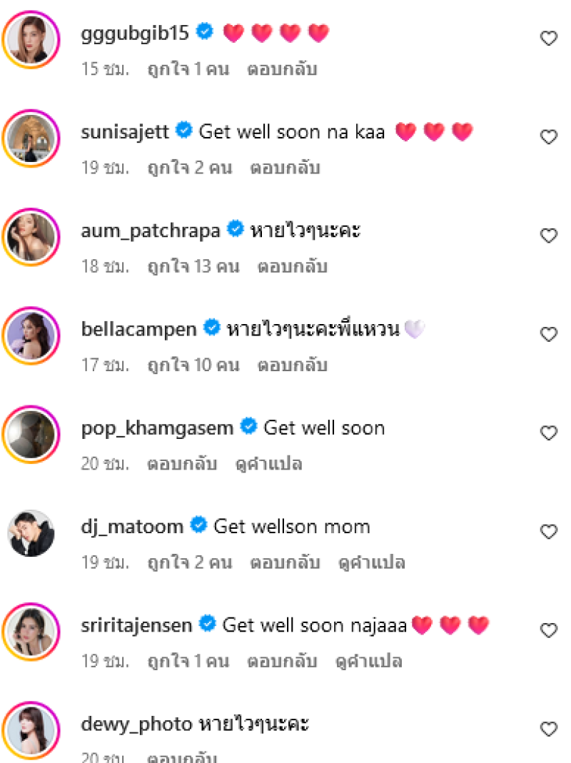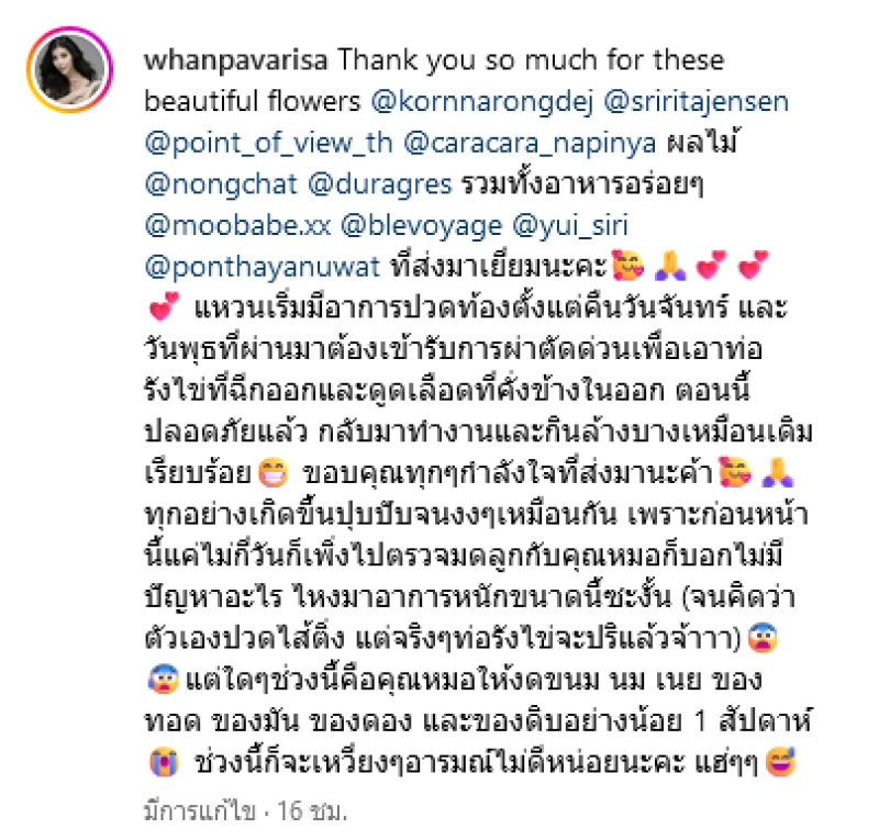 โดย แหวนแหวน โพสต์ในอินสตาแกรมว่า Thank you so much for these beautiful flowers ผลไม้รวมทั้งอาหารอร่อยๆที่ส่งมาเยี่ยมนะคะ แหวนเริ่มมีอาการปวดท้องตั้งแต่คืนวันจันทร์ และวันพุธที่ผ่านมาต้องเข้ารับการผ่าตัดด่วนเพื่อเอาท่อรังไข่ที่ฉีกออกและดูดเลือดที่คั่งข้างในออก ตอนนี้ปลอดภัยแล้ว กลับมาทำงานและกินล้างบางเหมือนเดิมเรียบร้อย
