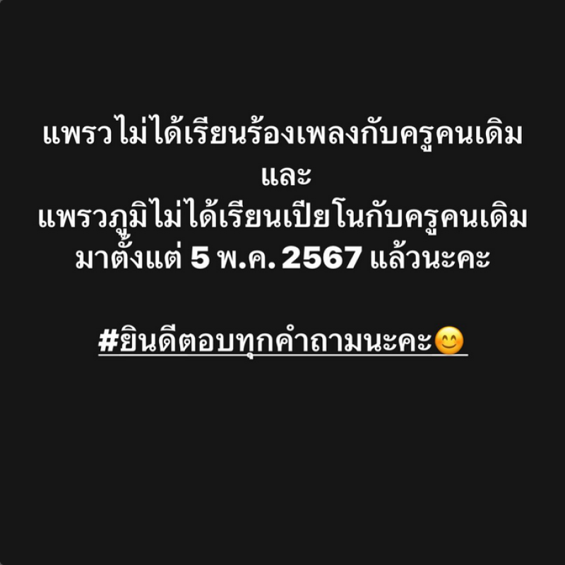 จากประเด็นที่ก่อนหน้านี้ซุปตาร์สาวคุณแม่ลูกสองอย่าง ตุ๊ก ชนกวนัน รักชีพ ได้โพสต์ข้อความลงในอินสตาแกรมส่วนตัวถึงเรื่องการเรียนของลูกทั้งสองคนว่า แพรวไม่ได้เรียนร้องเพลงกับครูคนเดิม และแพรวภูมิ ไม่ได้เรียนเปียโนกับครูคนเดิม มาตั้งแต่ 5 พ.ค. 2567 แล้วนะคะ ยินดีตอบทุกคำถามนะคะ