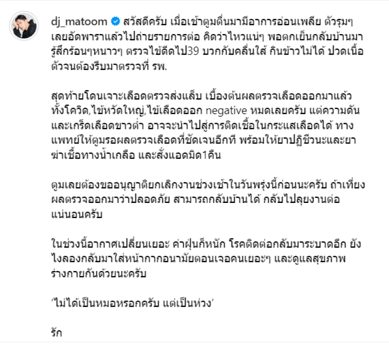 ตูมเลยต้องขออนุญาติยกเลิกงานช่วงเช้าในวันพรุ่งนี้ก่อนนะครับ ถ้าเที่ยงผลตรวจออกมาว่าปลอดภัย สามารถกลับบ้านได้ กลับไปลุยงานต่อแน่นอนครับ