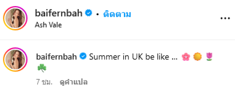 โดย ใบเฟิร์น ได้ทำการแพ็คกระเป๋าตีตั๋วไปประเทศอังกฤษ พร้อมเผยภาพบรรยากาศรอบบ้าน พร้อมระบุเเคปชั่นว่า Summer in UK be like ซึ่งทางด้าน ญาญ่า ก็ได้เข้ามาคอมเมนต์ว่า Cutie ทั้งนี้ยังมีแฟนๆได้เข้ามาคอมเมนต์ถึงความสดใสของ ใบเฟินร์น กันอย่างมากมาย