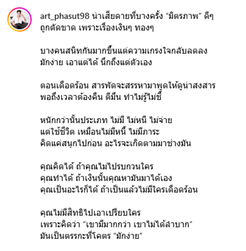 อีกหนึ่งพระเอกดังที่ตอนนี้ธุรกิจการค้ารุ่งเรืองและไปได้ดีเลยทีเดียวสำหรับ อาร์ต พศุตม์ บานแย้ม ที่มักจะโพสต์ข้อความในแง่คิดให้แฟนๆได้อ่านและได้ข้อคิดกันอยู่บ่อยๆ ล่าสุด อาร์ต ได้โพสต์ภาพพร้อมกับเขียนแคปชั่นเรื่องมิตรภาพและเงิน