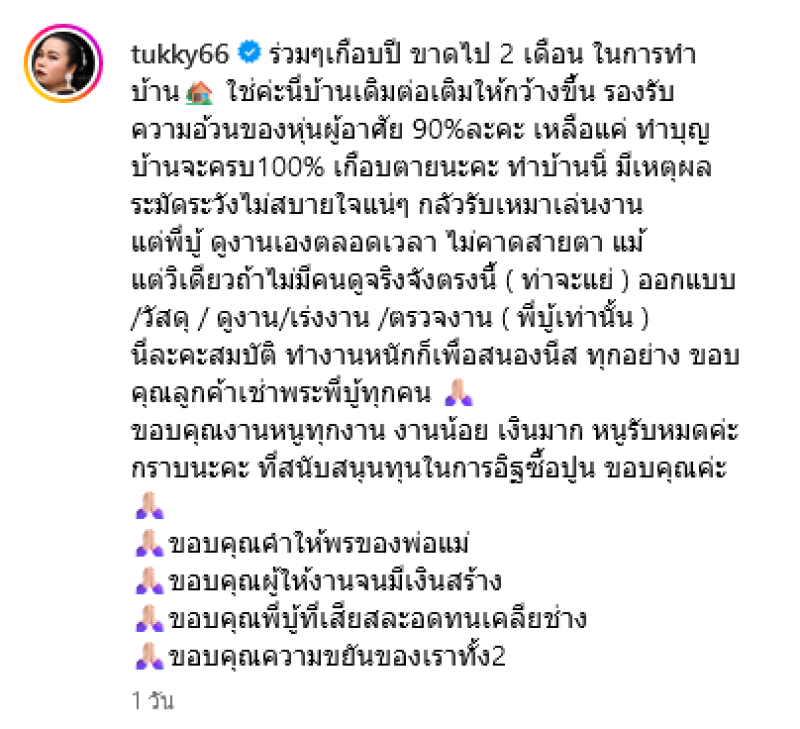 อีกหนึ่งตลกสาวชื่อดังที่ประสบความสำเร็จอีกขั้นสำหรับ ตุ๊กกี้ ชิงร้อยชิงล้าน ที่ล่าสุดได้มีบ้านหลังใหญ่อยู่แล้ว ซึ่งบ้านนี้เป็นบ้านของเธอกับสามี ทำงานเก็บเงินสร้างร่วมกัน และตอนนี้ก็เสร็จสิ้นขนของเข้าอยู่แล้ว โดย ตุ๊กกี้ โพสต์ข้อความในอินสตาแกรมส่วนตัวว่า