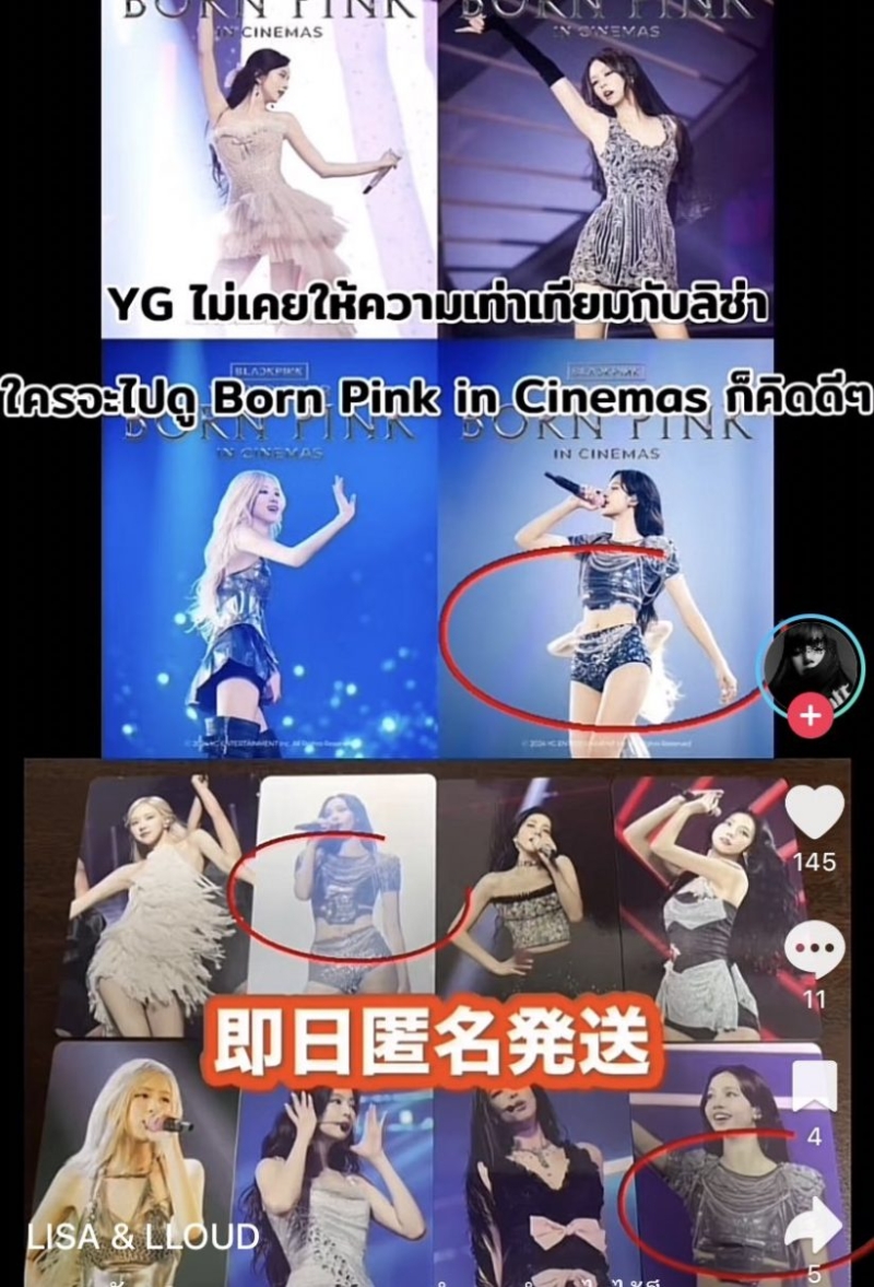 นอกจากนี้เเฟนคลับของลิซ่ายังประกาศไม่สนับสนุน Born Pink in Cinemasในครั้งนี้ของ YG ENT. เพราะดูไม่เเฟร์กับตัวลิซ่าเท่าไหร่ พร้อมทั้งยืนยันเสียงเเข็งว่าเงินจะออกจากกระเป๋าเเละจะขอสนับสนุนเเต่เพียงค่าย LLOUD ของลิซ่าเท่านั้น งานนี้แฟนๆต่างคอมเมนต์ถึงประเด็นชุดกันอย่างมากมาย อาทิ ลิซ่ามีแค่ชุดเดิมซ้ำๆ ค่ะ,3 ภาพ เลือกเอาลิซ่าชุดเดียวตลอด ในขณะที่เมมคนอื่นๆ เปลี่ยนชุด 3 ชุด เป็นต้น