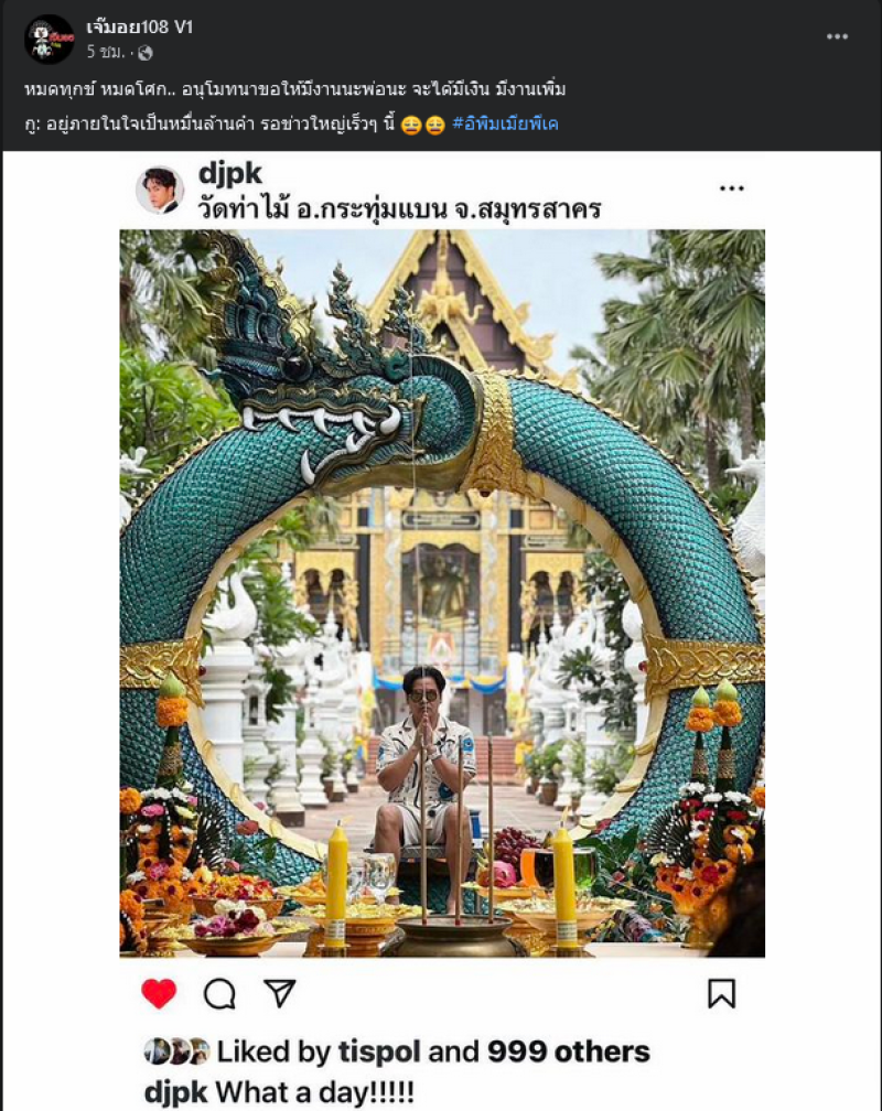 จากนั้นเพจ เจ๊มอย108 V1 ก็นำมาแชร์ต่อในเฟซบุ๊ก พร้อมแคปชั่นบอกว่า ....หมดทุกข์ หมดโศก.. อนุโมทนาขอให้มีงานนะพ่อนะ จะได้มีเงิน มีงานเพิ่ม