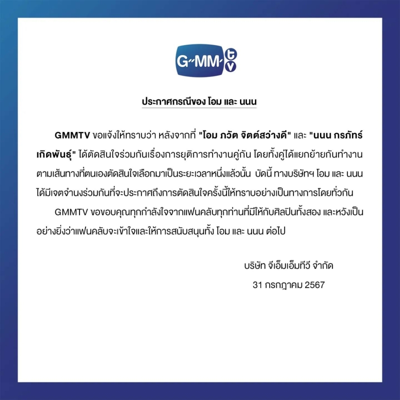 โดยได้เผยว่า GMMTV ขอแจ้งให้ทราบว่า หลังจากที่ โอม ภวัต จิตต์สว่างดี และ นนน กรภัทร์ เกิดพันธุ์ ได้ตัดสินใจร่วมกันเรื่องการยุติการทำงานคู่กัน โดยทั้งคู่ได้แยกย้ายกันทำงาน ตามเส้นทางที่ตนเองตัดสินใจเลือกมาเป็นระยะเวลาหนึ่งแล้วนั้น บัดนี้ ทางบริษัทฯ โอม และ นนน