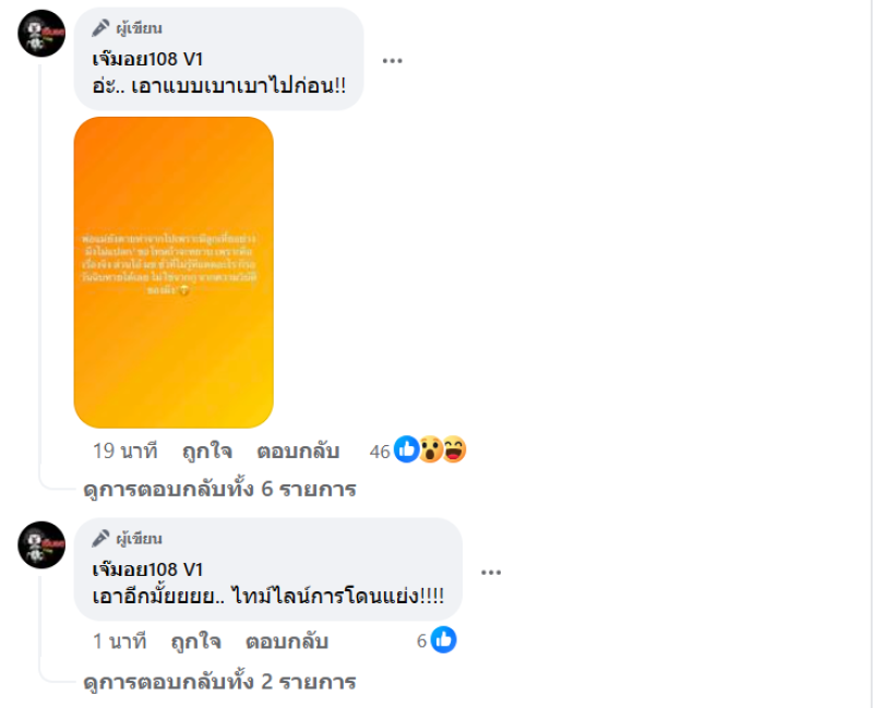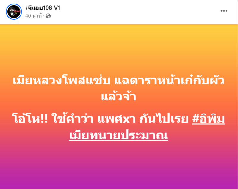 จากกรณีที่ก่อนหน้านั้น ได้มีข่าวเมียหลวง เผยสามีแอบคบดาราหน้าเก๋ เจ็บใจยิ่งกว่า คือน้องรักในแก๊งเดียวกัน ซึ่งล่าสุดทางเพจดัง อย่าง เจ๊มอย108 V1 ได้ออกมาเปิดต่อว่า เมียหลวงโพสแซ่บ แฉดาราหน้าเก๋กับผัวแล้วจ้า โอ้โห!! ใช้คำว่า แพศxา กันไปเรย #อิพิมเมียทนายประมาณ