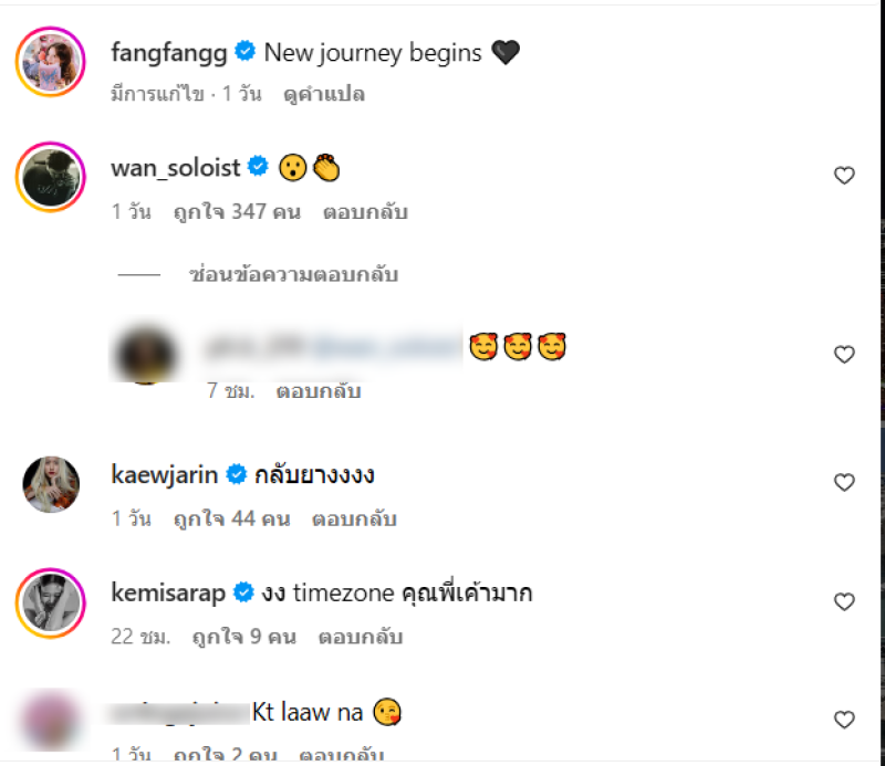 ล่าสุด แฟนๆได้จับตาถึงความสัมพันธ์ของทั้งคู่อีกครั้ง เมื่อทางฟาง ได้โพสต์ภาพไปเที่ยวที่ต่างประเทศ ซึ่งเป็นรูปขณะเดินทาง พร้อมระบุแคปชั่นว่า New journey begins แต่ที่ทำเอาแฟนๆใจฟุอีกครั้ง เมื่อทาง หนุ่มว่านนั้น ได้โผล่คอมเมนต์สาวฟาง พร้อมอิโมจิ ยิ่งทำเอาหลายๆคนคิดว่า ตกลงทั้งคู่เลิกกันยัง หรือยังไม่เลิกกันนั่นเอง