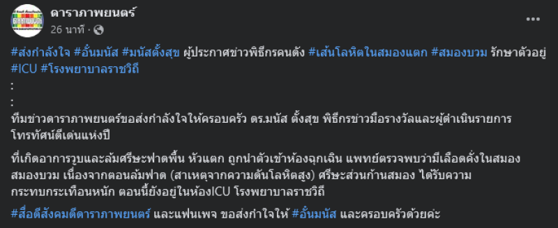 อีกหนึงผู้ประกาศข่าวพิธีกรคนดัง ดร.มนัส ตั้งสุข ที่ล่าสุดเพจ ดาราภาพยนตร์ ได้โพสต์แจ้งว่า ดร.มนัส ตั้งสุข เส้นโลหิตในสมองแตก สมองบวม รักษาตัวอยู่ ซึ่งเป็นพิธีกรข่าวมือรางวัลและผู้ดำเนินรายการโทรทัศน์ดีเด่นแห่งปีอีกด้วย