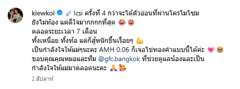 โดย เกี่ยวก้อย ได้โพสต์คลิปพร้อมแคปชั่นว่า Icsi ครั้งที่ 4 กว่าจะได้ตัวอ่อนที่ผ่านโครโมโซม ยังไม่ท้อง แต่ดีใจมากกกกที่สุด ตลอดระยะเวลา 7 เดือนทั้งเหนื่อย ทั้งท้อ แต่ก็สู้หนักขึ้นเรื่อยๆ เป็นกำลังใจให้แม่ๆนะคะ AMH 0.06 ก็เจอไข่ทองคำแบบนี้ได้ค่ะ ขอบคุณคุณหมอและทีม @gfc.bangkok ที่ช่วยดูแลน้องและเป็นกำลังใจให้แม่มาตลอดนะคะ