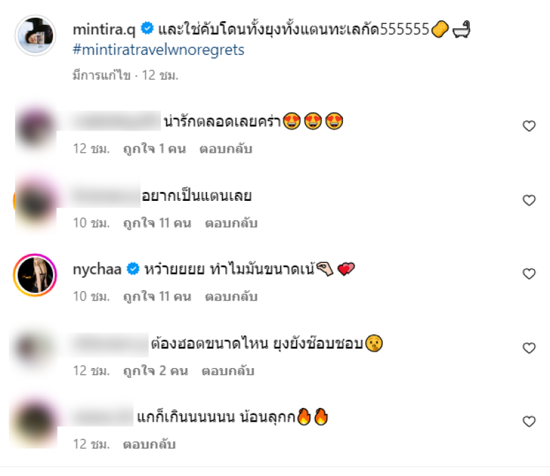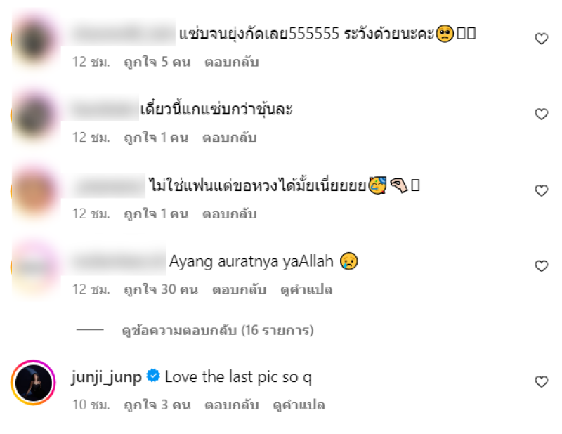 งานนี้ เหล่าเพื่อนๆและแฟนคลับเข้ามาคอมเมนต์กันจำนวนมาก อาทิ น่ารักตลอดเลยคร่า,ต้องฮอตขนาดไหน ยุงยังช๊อบชอบ,ไม่ใช่แฟนแต่ขอหวงได้มั้ยเนี่ยยยย,เดี๋ยวนี้แกแซ่บกว่าชุ้นละ,แซ่บจนยุ่งกัดเลย555555 ระวังด้วยนะคะ เป็นต้น