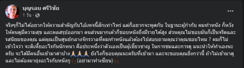 งานนี้ทางด้านเอกชัยได้ตอยกลับเดือดว่า จริงๆก็ไม่ได้อยากให้ความสำคัญกับไอ้เพจนี้สักเท่าไหร่ แต่ก็อยากจะพูด ในฐานะผู้กำกับ ผมทำหนัง ก็หวังให้คนดูมีความสุข และผลสรุปออกมา คนส่วนมากเค้าก็ชอบหนังถึงมีรายได้สูง ส่วนคุณไม่ชอบมันก็เป็นจริตและรสนิยมของคุณ แต่คุณเป็นศูนย์กลางจักรวาลที่ผมทำหนังแล้วต้องไปสอบถามคุณว่าคุณชอบไหม ?