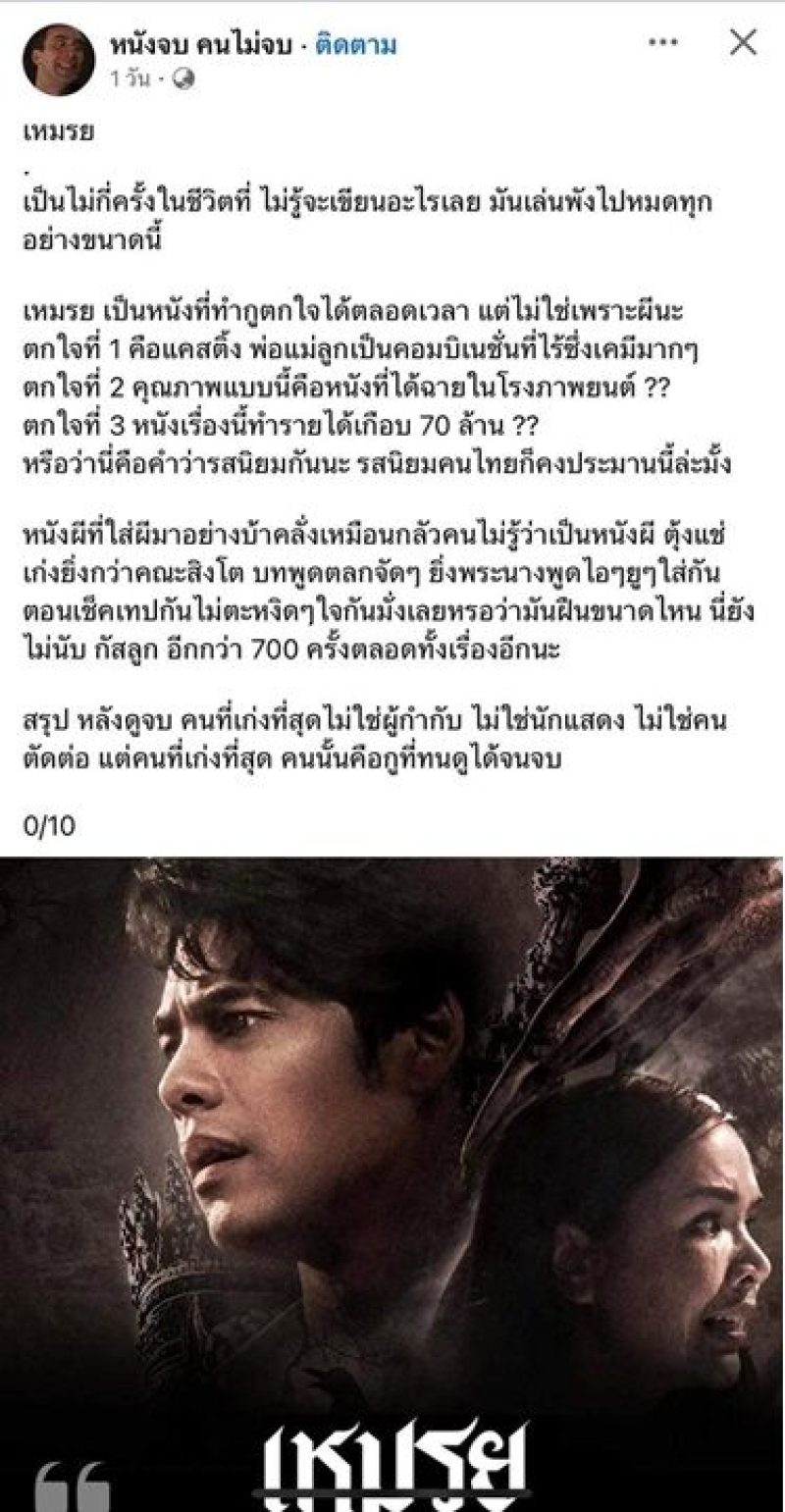 ทำเอาผู้กำกับหนังอย่าง เอกชัย ศรีวิชัย เดือดไม่น้อยเลยทีเดียว หลังมีเพจดังวิจารณ์ถึงหนัง เหมรฺย ค่อนข้างจะรุนแรงคือ เหมรฺย เป็นหนังที่ทำxูตกใจได้ตลอดเวลา แต่ไม่ใช่เพราะผีนะ ตกใจที่ 1 คือแคสติ้ง พ่อแม่ลูกเป็นคอมบิเนชั่นที่ไร้ซึ่งเคมีมากๆ ตกใจที่ 2 คุณภาพแบบนี้คือหนังที่ได้ฉายในโรงภาพยนตร์?? ตกใจที่ 3 หนังเรื่องนี้ทำรายได้เกือบ 70 ล้าน?? หรือว่านี่คือคำว่ารสนิยมกันนะ รสนิยมคนไทยก็คงประมาณนี้ล่ะมั้ง พร้อมทั้งตอนท้ายยังให้คะแนน 0 เต็ม 10 ด้วย