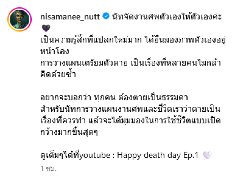 ล่าสุด นัท นิสามณี ได้ออกมาโพสต์ภาพหลังจากที่จัดงานศพให้ตัวเอง พร้อมเขียนเเคปชั่นว่า นัทจัดงานศพตัวเองให้ตัวเองค่ะ เป็นความรู้สึกที่แปลกใหม่มาก ได้ยืนมองภาพตัวเองอยู่หน้าโลงการวางแผนเตรียมตัวตาย เป็นเริ่องที่หลายคนไม่กล้าคิดด้วยซ้ำ อยากจะบอกว่า ทุกคน ต้องตายเป็นธรรมดา สำหรับนัทการวางแผนงานศพและชีวิตเราว่าตายเป็นเรื่องที่ควรทำ แล้วจะได้มุมมองในการใช้ชีวิตแบบเปิดกว้างมากขึ้นสุดๆ งานนี้ทำเอาแฟนๆแห่เข้ามาคอมเมนต์กันอย่างมาก
