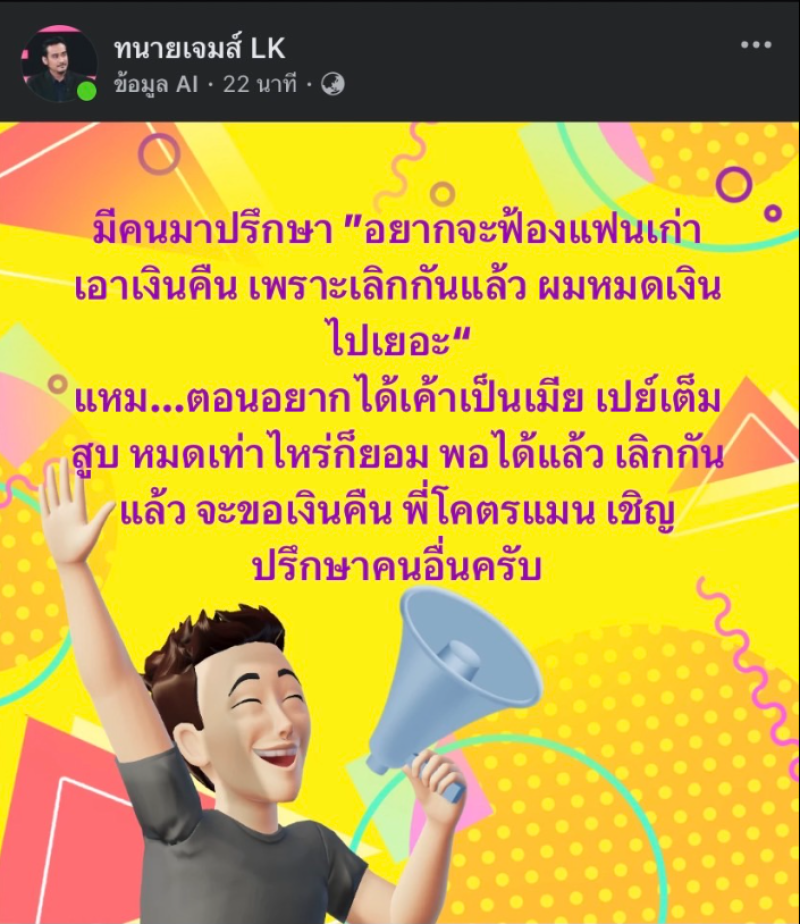จากกรณีที่กำลังมาแรงเกี่ยวประเด็น เลิกกันแล้ว แต่อยากได้เงินคืน กำลังมาแรง ซึ่งล่าสุดทางด้าน ทนายเจมส์ ได้ออกมาโพสต์ผ่านเพจ ทนายเจมส์ LK ว่า มีคนมาปรึกษา ”อยากจะฟ้องแฟนเก่า เอาเงินคืน เพราะเลิกกันแล้ว ผมหมดเงินไปเยอะ