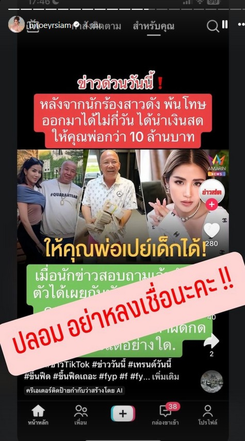 ถึงประเด็นที่ว่า หลังจากนักร้องสาวดัง พ้นโทษออกมาได้ไม่กี่วัน ได้นำเงินสดให้คุณพ่อกว่า 10 ล้านบาท ให้คุณพ่อเปย์เด็กได้ ล่าสุด ใบเตย ได้ออกมาเคลื่อนไหว พร้อมทั้งใช้พื้นที่บนอินสตราแกรม ตอบกลับข่าวลือมั่วๆว่า "ปลอม อย่าหลงเชื่อนะคะ"