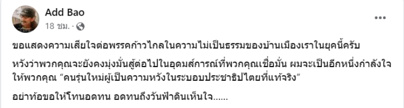 ล่าสุด ทาง แอ๊ด คาราบาว เคลื่อนไหวโพสต์เฟสบุ๊ก Add Bao โดยได้ระบุข้อความว่า ขอแสดงความเสียใจต่อพรรคก้าวไกลในความไม่เป็นธรรมของบ้านเมืองเราในยุคนี้ครับ หวังว่าพวกคุณจะยังคงมุ่งมั่นสู้ต่อไปในอุดมส์การณ์ที่พวกคุณเชื่อมั่น ผมจะเป็นอีกหนึ่งกำลังใจให้พวกคุณ คนรุ่นใหม่ผู้เป็นความหวังในระบอบประชาธิปไตยที่แท้จริง" อย่าท้อขอให้โทนอดทน อดทนถึงวันฟ้าดินเห็นใจ.