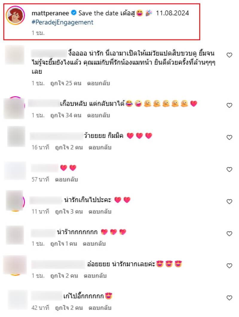 โดย แมท ได้โพสต์คลิปกำลังจัดเตรียมงานและได้เผยฤกษ์ที่จะเป็นวันที่สำคัญอีกวันของชีวิตไว้ด้วยว่า Save the date เด้อสู 11.08.2024 #PeradejEngagement งานนี้แฟนๆแห่เข้ามาคอมเมนต์กันอย่างมาก อาทิ งื้ออออ น่ารัก นี่เอามาเปิดให้แม่วัยแปดสิบขวบดู ยิ้มจนไม่รู้จะยิ้มยังไงแล้ว คุณแม่กับพี่รักน้องแมทน้า ยินดีด้วยครั้งที่ล้านๆๆๆ เลย,น่ารักเกินไปปะคะ,เก๋ไปอี้กกกกกก เป็นต้น
