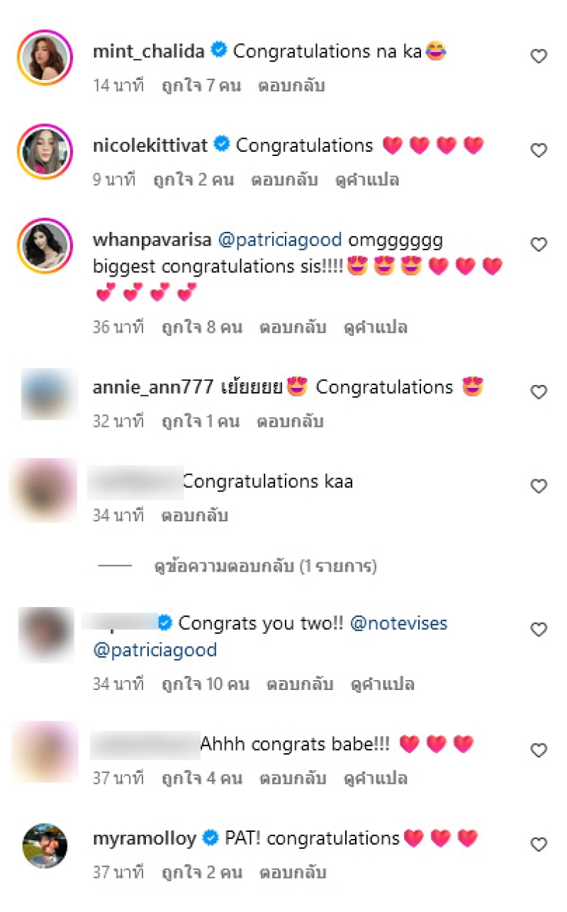 ทางด้าน แพทริเซีย ได้เขียนแคปชั่นระบุว่า สุขสันต์วันแม่ค่ะ ปีที่ 2 ของการได้ celebrate ในฐานะแม่ แต่ปีนี้พิเศษขึ้นอีกเพราะมีตัวเล็กอีกคนในท้อง เอลิเซียจะเป็นพี่แล้วค่า แม่ลูก 2 is coming soon! Happy Thai Mothers Day overjoyed to be welcoming another member to our family! งานนี้แฟนๆและเพื่อนวงการต่างแสดงความยินดีกันอย่างมาก