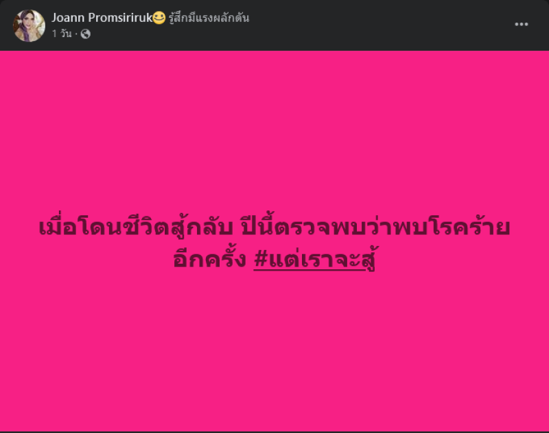 เรียกได้ว่าเป็นนางโชว์รุ่นใหญ่ วัย 67ปีสำหรับ โจแอน บุญสูงเนิน เจ้าของฉายา มนุษย์ 100 เสียง ที่ล่าสุดทำเอาแฟนๆต่างส่งกำลังใจให้รัวๆ เมื่อ โจแอน ได้ออกมาโพสต์ข้อความในเฟซบุ๊คส่วนตัว ว่าตรวจพบโรคร้ายอีกครั้ง พร้อมเขียนแคปชั่นว่า เมื่อโดนชีวิตสู้กลับ ปีนี้ตรวจพบว่าพบโรคร้ายอีกครั้ง #แต่เราจะสู้