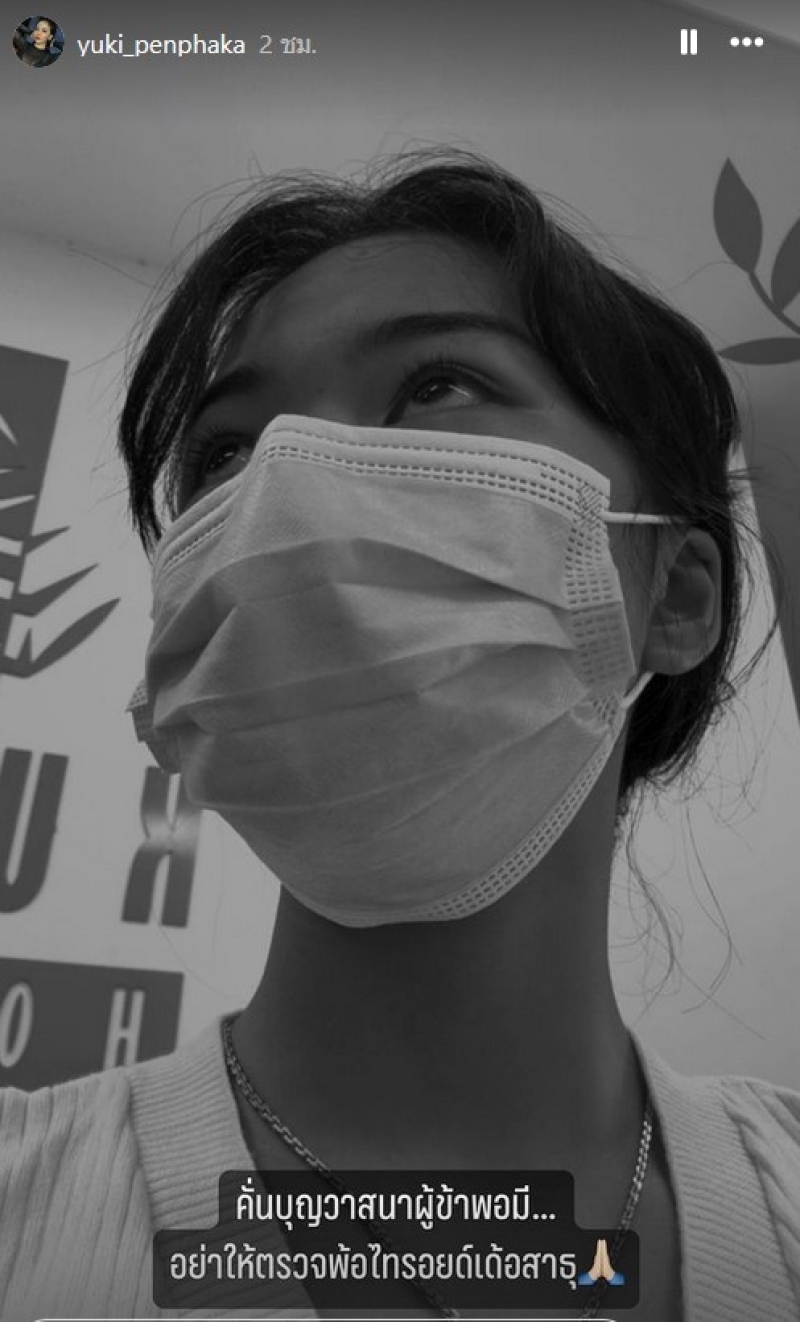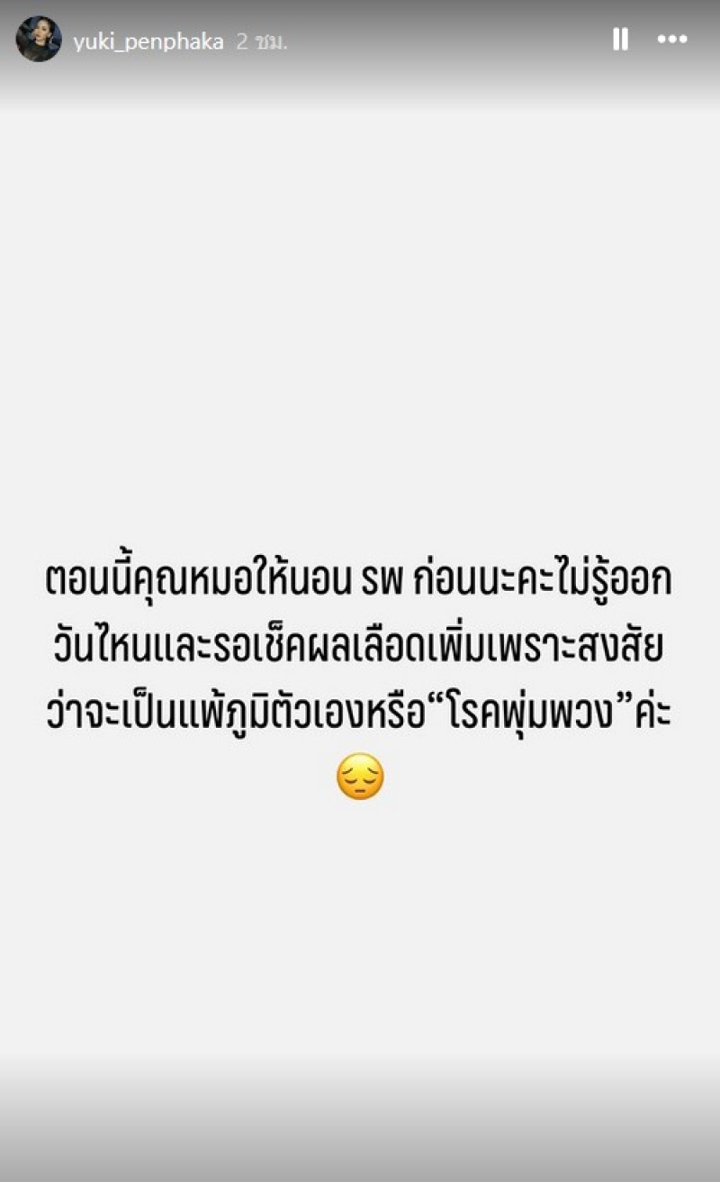 เมื่อวันที่ 15 ส.ค. โพสต์ข้อความผ่านสตอรี่อินสตราแกรมส่วนตัวบอกว่า คั่นบุญวาสนาผู้ข้าพอมี ... อย่าให้ตรวจพ้อไทรอยด์เด้อสาธุ ต่อมาโพสต์บอกว่า "ตอนนี้คุณหมอให้นอน รพ ก่อนนะคะ ไม่รู้ออกวันไหนและรอเช็คผลเลือดเพิ่ม เพราะสงสัยว่าจะเป็นแพ้ภูมิตัวเองหรือ โรคพุ่มพวง ค่ะ