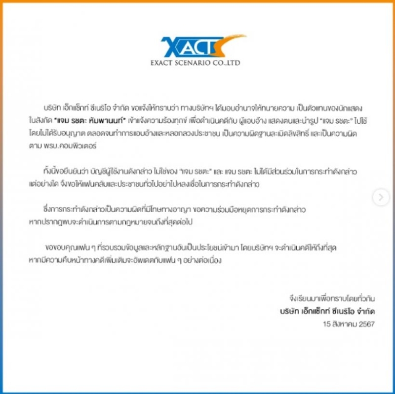 บริษัท เอ็กแซ็กท์ ซีเนริโอ จำกัด ขอเจ้งให้ทราบว่า ทางบริษัทฯ ได้มอบอำนาจให้ทนายความ เป็นตัวแทนของนักแสดงในสังกัด "แจม รชตะ หัมพานนท์" เข้าแจ้งความร้องทุกข์ เพื่อดำเนินคดีกับ ผู้แอบอ้าง แสดงตนและนำรูป "แจม รชตะ" ไปใช้ โดยไม่ได้รับอนุญาต ตลอดจนทำการแอบอ้างและหลอกลวงประชาชน เป็นความผิดฐานละเมิดสิทธิ์ และเป็นความผิดตาม พรบ.คอมผิวเตอร์