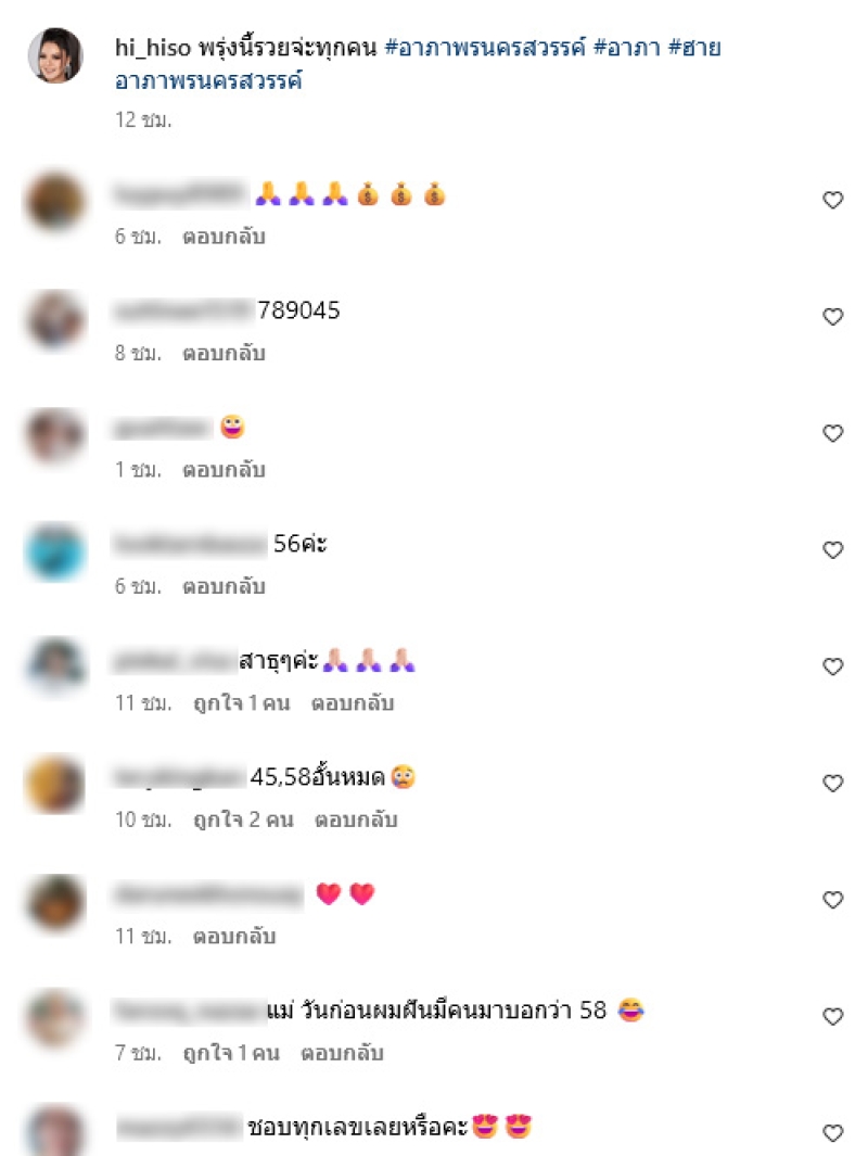 ล่าสุด ฮาย ได้โพสต์คลิปเลขธูปพร้อมเขียนแคปชั่นว่า พรุ่งนี้รวยจ๊ะทุกคน ซึ่งภายในคลิป ฮาย พร้อมลั่นว่า อุ๊ยเลขแม่เลย 45 อายุแม่เลย แล้วแม่บอกว่ามี 8 มี 5 เห็นมั้ย แต่ยายบอกยายชอบ 0 เราชอบเลข 9 เลข 7 เลข 6 นี่แหละ งานนี้แฟนๆต่างเข้ามาคอมเมนต์ อาทิ 56ค่ะ,45,58อั้นหมด,แม่ วันก่อนผมฝันมีคนมาบอกว่า 58 ,ชอบทุกเลขเลยหรือคะ เป็นต้น