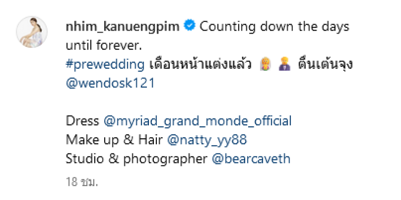 ล่าสุด หนิง ได้ออกมาโพสต์ภาพถ่ายพรีเวดดิ้งคู่กับว่าที่เจ้าบ่าว พร้อมเขียนเเคปชั่นว่า Counting down the days until forever. #prewedding เดือนหน้าแต่งแล้ว ตื่นเต้นจุง งานนี้แฟนๆแห่คอมเมนต์ชมว่าที่เจ้าสาวกันอย่างมาก อาทิ จ๋วยมากกกก,เจ้าสาวสวยม้ากกก,ยินดีด้วยนะคะพี่หนิม เป็นต้น