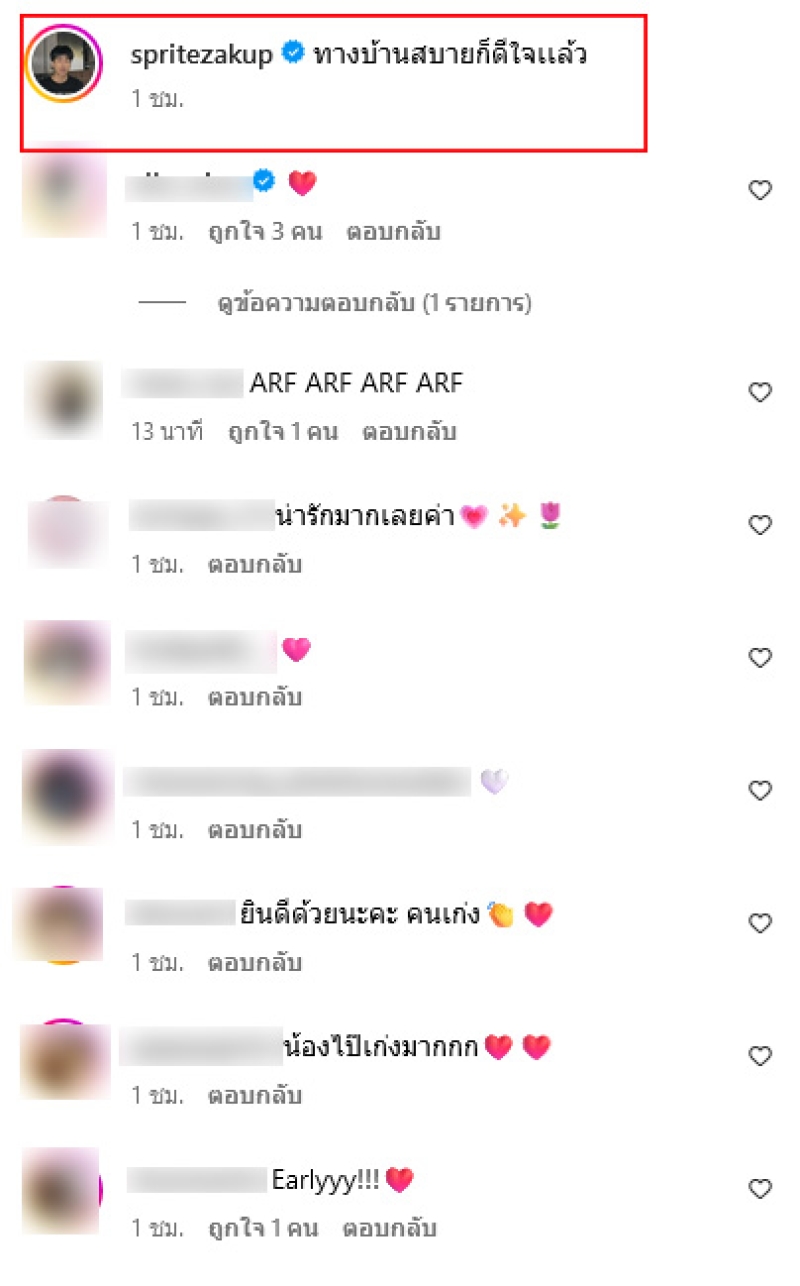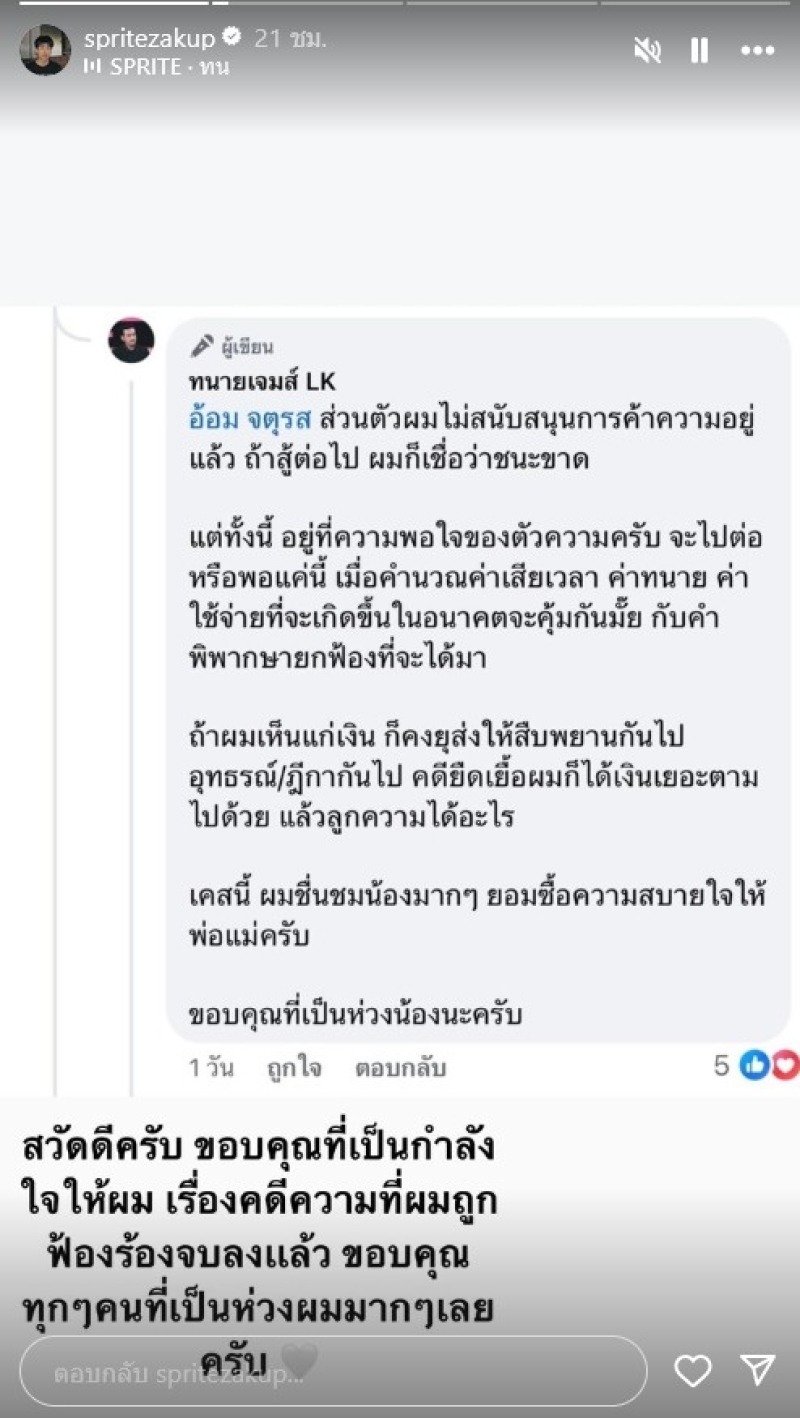ในขณะที่น้องสไปร์ท ได้มีการเคลื่อนไหวโดยโพสต์สตอรี่อินสตราแกรม ระบุข้อความบอกว่า สวัสดีครับ ขอบคุณที่เป็นกำลังใจให้ผม เรื่องคดีความที่ผมถูกฟ้องร้องจบลงแล้ว ขอบคุณทุกๆคนที่เป็นห่วงผมมากๆเลยครับ ต่อมาเผยภาพตัวเองและการทำงาน พร้อมแคปชั่นระบุว่า "ทางบ้านสบายก็ดีใจเเล้ว" ท่ามกลางแฟนคลับชื่นชมความเก่งจำนวนมาก