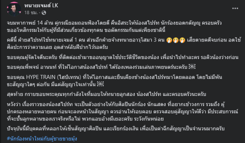 จากประเด็นที่ ต้นสังกัดเก่าของ สไปรท์ ศุกลวัฒน์ พวงสมบัติ ฟ้องน้องสไปร์ท 14 ล้าน ต่อมามีการลดเหลือฟ้อง 7 ล้าน และมีการไกล่เกลี่ย แต่ไม่เป็นผล ตามที่เสนอข่าวไปแล้วนั้นล่าสุดทางด้าน ทนายเจมส์ อัปเดตคดีจบมหากาพย์ 14 ล้าน คู่กรณียอมถอนฟ้องโดยดี คืนอิสระให้น้องสไปร์ท นักร้องยอดกตัญญู ครอบครัวขออโหสิกรรมให้กับผู้ที่มีส่วนเกี่ยวข้องทุกคน ขอตัดกรรมกันแต่เพียงชาตินี้