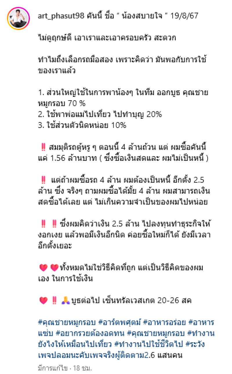 โดยทางด้าน อาร์ต ได้โพสต์ข้อความผ่านอินสตาแกรมส่วนตัว เผยโฉมรถตู้ ที่ซื้อด้วยเงินสด และเผยสาเหตุไม่ซื้อป้ายแดง โดยบอกว่า "คันนี้ ชื่อ " น้องสบายใจ " 19/8/67 ไม่ดูฤกษ์ดี เอาเราและเอาครอบครัว สะดวก ทำไมถึงเลือกรถมือสอง เพราะคิดว่า มันพอกับการใช้ของเราแล้ว 1. ส่วนใหญ่ใช้ในการพาน้องๆ ในทีม ออกบูธ คุณชายหมูกรอบ 70 % 2. ใช้พาพ่อแม่ไปเที่ยว ไปทำบุญ 20% 3. ใช้ส่วนตัวนิดหน่อย 10%