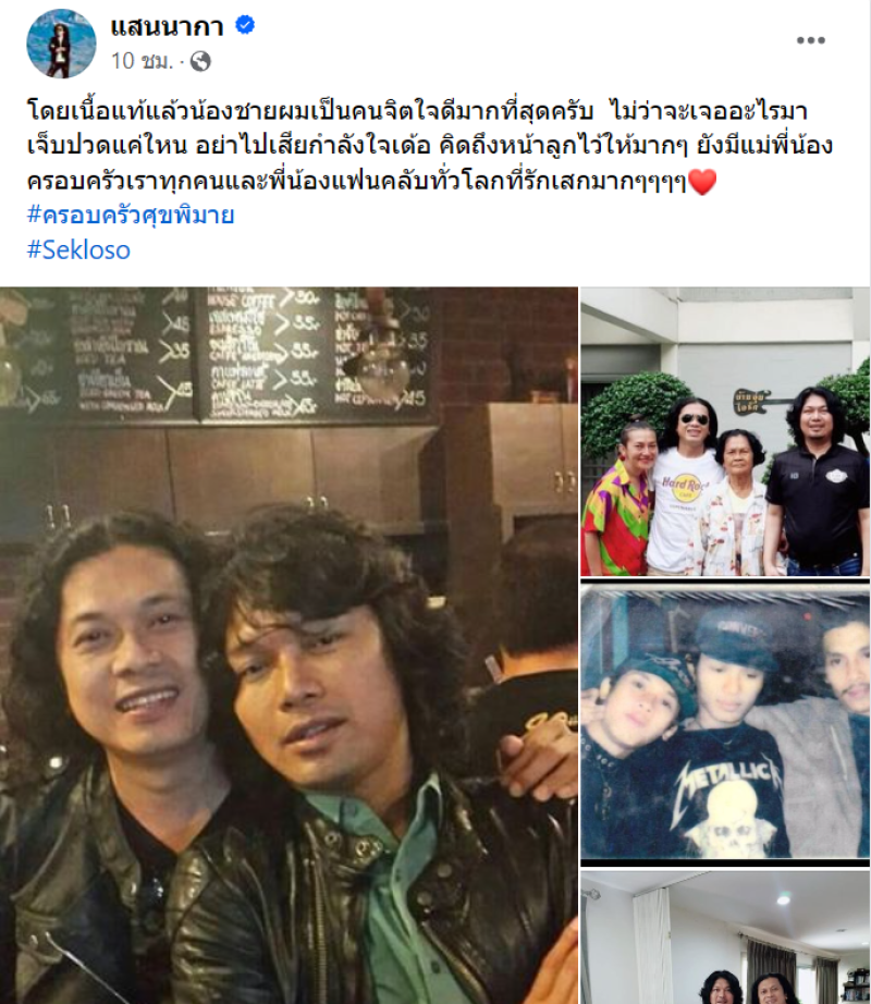 ล่าสุด ทางพี่ชาย แสนนากา พี่ชายเสก โลโซ ก็ออกมาโพสต์ข้อความผ่านเฟซบุ๊กส่วนตัว พูดถึงน้องชาย และหยิบภาพครอบครัวมาโพสต์ร่วมกับแคปชั่น ให้กำลังใจและเผยเนื้อแท้ของ เสก โลโซ ว่า โดยเนื้อแท้แล้วน้องชายผมเป็นคนจิตใจดีมากที่สุดครับ ไม่ว่าจะเจออะไรมา เจ็บปวดแค่ใหน อย่าไปเสียกำลังใจเด้อ คิดถึงหน้าลูกไว้ให้มากๆ ยังมีแม่พี่น้องครอบครัวเราทุกคนและพี่น้องแฟนคลับทั่วโลกที่รักเสกมากๆๆๆๆ #ครอบครัวศุขพิมาย #Sekloso