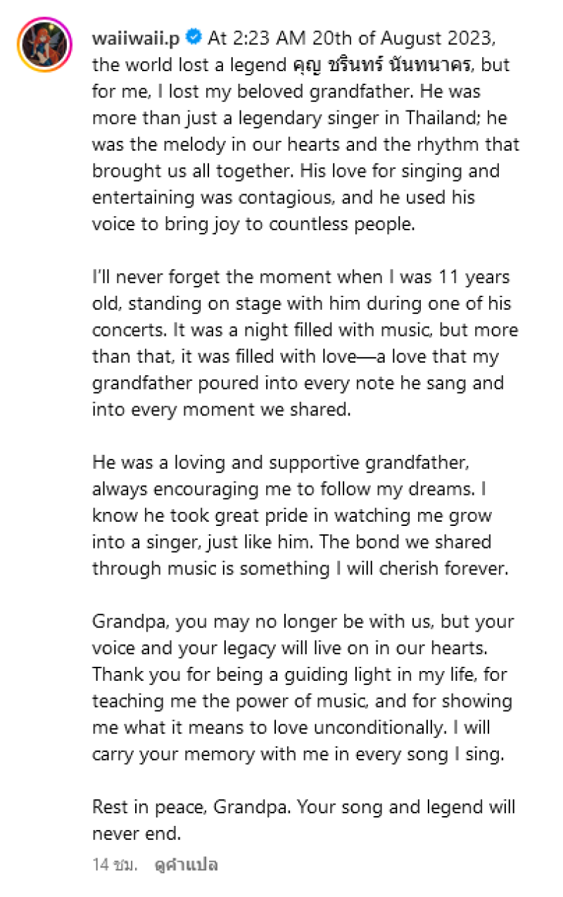ล่าสุดนักร้องสาว หวาย ปัญญ์ธิษา หลานสาวของ ชรินทร์ นันทนาคร ได้ออกมาโพสต์ภาพพร้อมเขียนข้อความว่า At 2:23 AM 20th of August 2023, the world lost a legend คุญ ชรินทร์ นันทนาคร, but for me, I lost my beloved grandfather. He was more than just a legendary singer in Thailand; he was the melody in our hearts and the rhythm that brought us all together. His love for singing and entertaining was contagious, and he used his voice to bring joy to countless people.