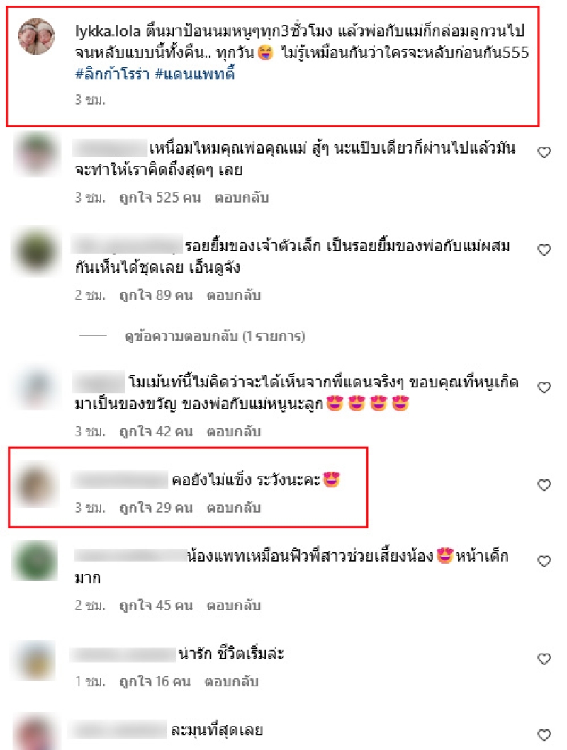 ล่าสุดอินสตราแกรมของน้องแฝด เผยคลิปที่คุณพ่อคุณแม่ช่วยกันเลี้ยงลูกเอง กล่อมลูกนอนด้วยตัวเอง พร้อมแคปชั่นระบุว่า "ตื่นมาป้อนนมหนูๆทุก3ชั่วโมง แล้วพ่อกับแม่ก็กล่อมลูกวนไปจนหลับแบบนี้ทั้งคืน.. ทุกวัน ไม่รู้เหมือนกันว่าใครจะหลับก่อนกัน555 #ลิกก้าโรร่า #แดนแพทตี้" ท่ามกลางแฟนคลับชมความอบอุ่น ความน่ารักของครอบครัวนี้ ก็พากันเตือนว่า "คอยังไม่แข็ง ระวังนะคะ"ซึ่งมีชาวเน็ตทยอยกดไลค์เห็นด้วยจำนวนมาก