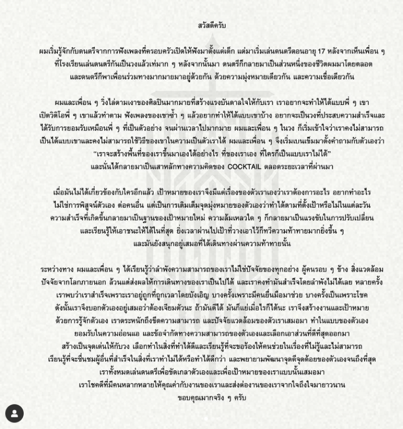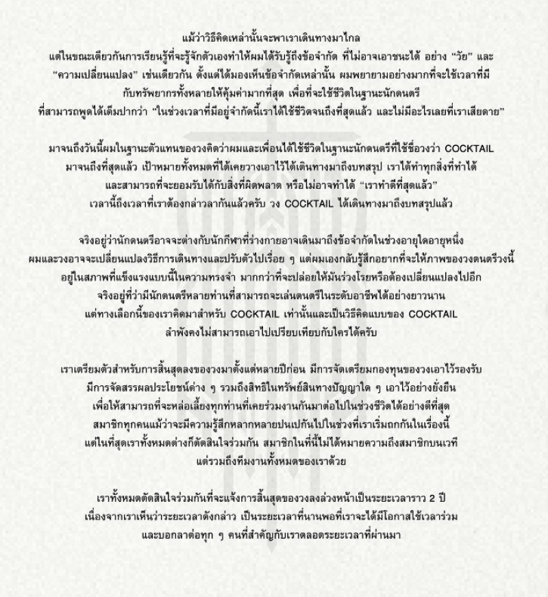 ด้วยเหตุผลทั้งหมดนี้เราขอบอกกับทุกคนว่า “วง COCKTAIL จะสิ้นสุดลงในปี 2025 โดยหลังจากนั้นจะไม่มีการเล่นดนตรีในนามวง COCKTAIL อีก เราทั้งหมดจะแยกย้ายกันเดินทางไปสู่ช่วงเวลาใหม่ในชีวิต และผมในฐานะนักร้องนำจะไม่แสดงดนตรีเป็นอาชีพอีกต่อไปเช่นกันครับ”
